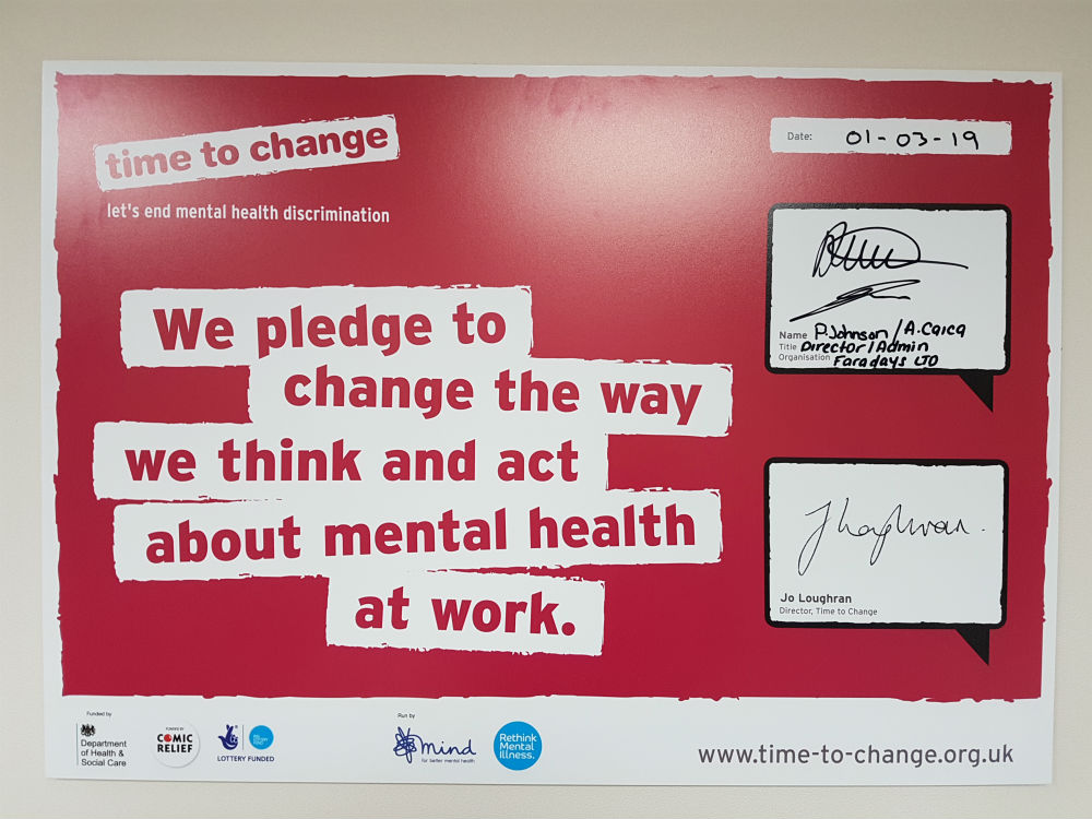 Today on the 1st of March 2019 Faradays Ltd signed the Employers Pledge with Time to Change. By signing this Faradays promises to change the way our company thinks and acts about Mental Health. Faradays will be continuingly creating an open environment where Mental Health is supported, understood and free of judgment. More about Time to Change organisation and Employers Pledge you can find on www.time-to-change.org.uk
