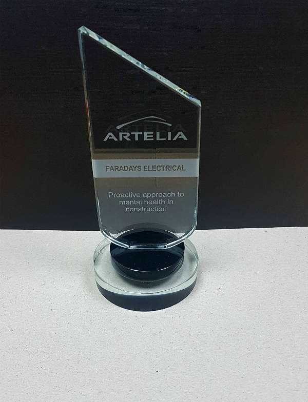 As a result of Faradays Mental Health Awareness training with “Mates in Mind” earlier this year and further progression around the issues of Mental Health support within the company, Faradays received an award from one of our prime clients Artelia Uk. The award was presented to Paul Johnson (Operations Director) in the recognition of Faradays proactive approach to Mental Health Awareness in the Construction Industry.